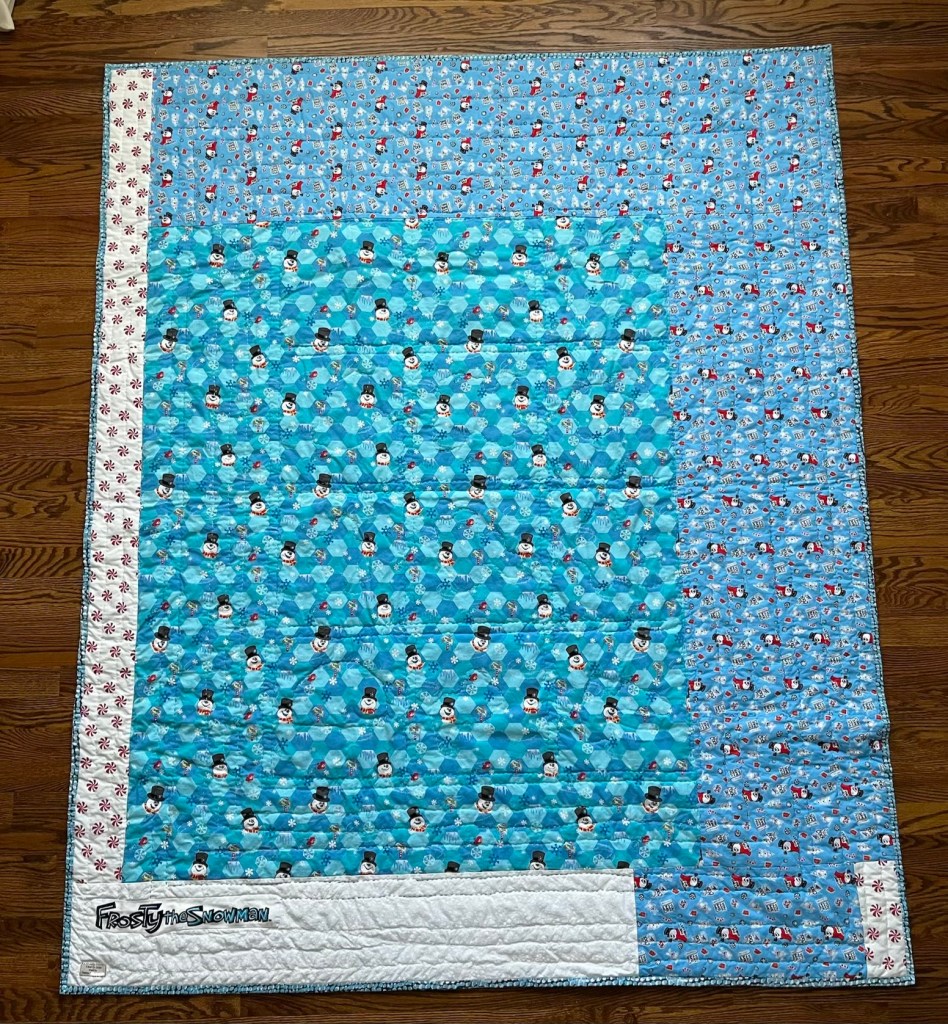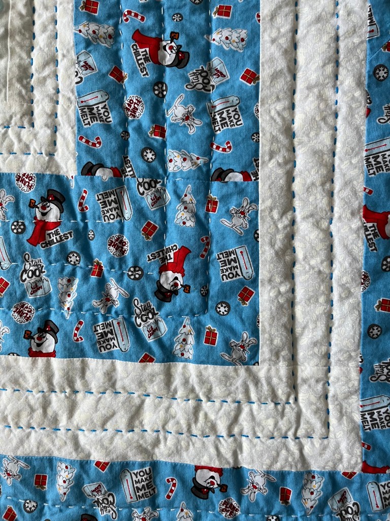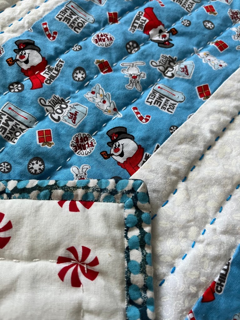 The quilt is bound with a non-Frosty, non-Christmas blue and white patterned fabric. While thematically it doesn’t fit, the colors are just about spot-on. Huzzah for making it work!