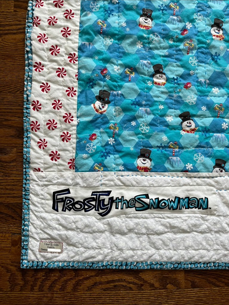 From the original cut-and-sew panel, I snagged the “Frosty the Snowman” logo. Using the needle-turn appliqué technique, I attached the logo to the back of the quilt, right above my label. That Rankin/Bass typography is just sooo good.