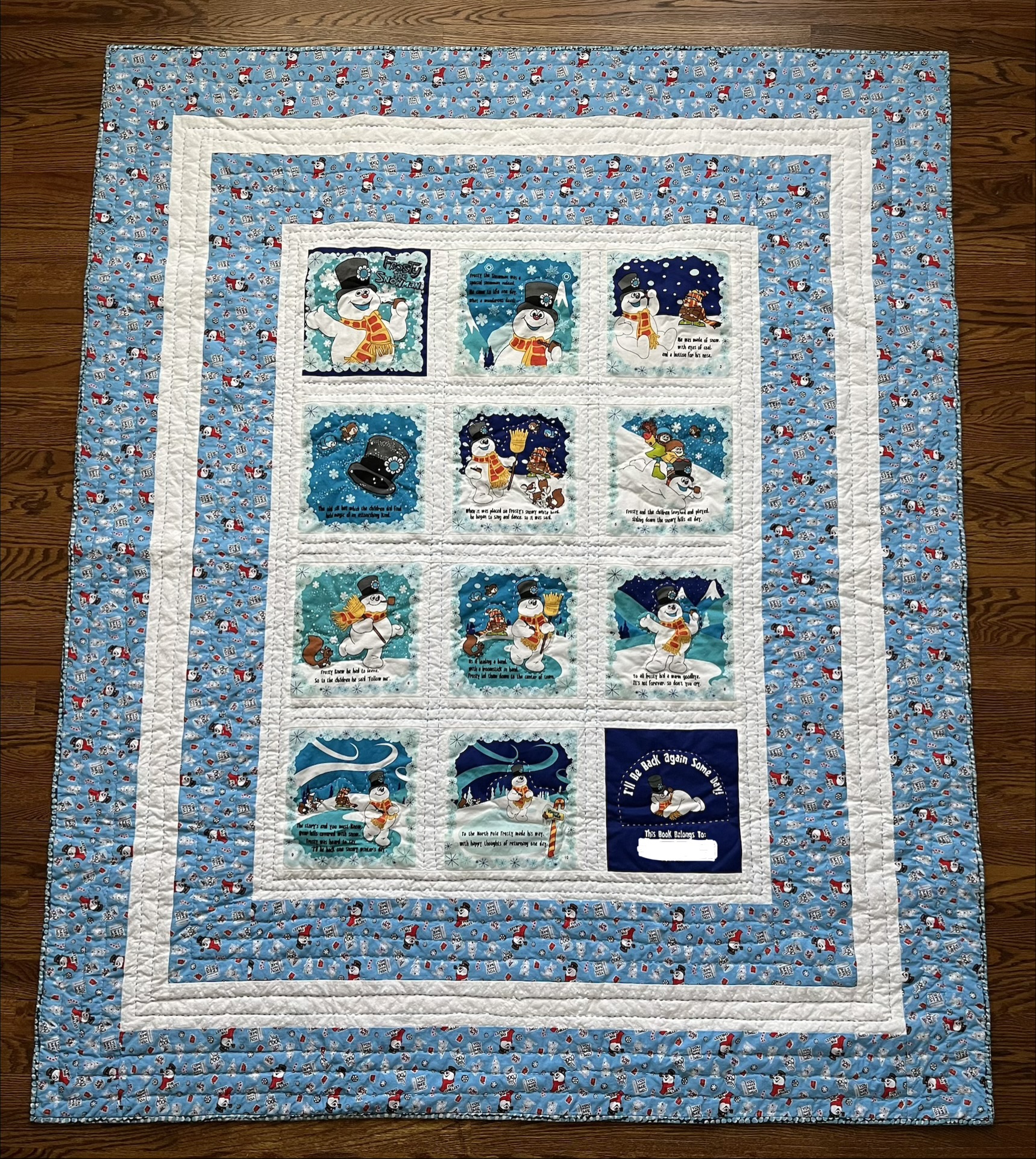 My Frosty the Snowman Christmas Quilt is based on my Rudolph the Red-Nosed Reindeer Christmas Quilt. When I found a cut-and-sew fabric book panel for the story of Frosty the Snowman that was similar to the Rudolph panel I used for that quilt, I knew I wanted to make another quilt. The Rudolph Quilt is one of my family’s favorites and is out on our couch year-round.