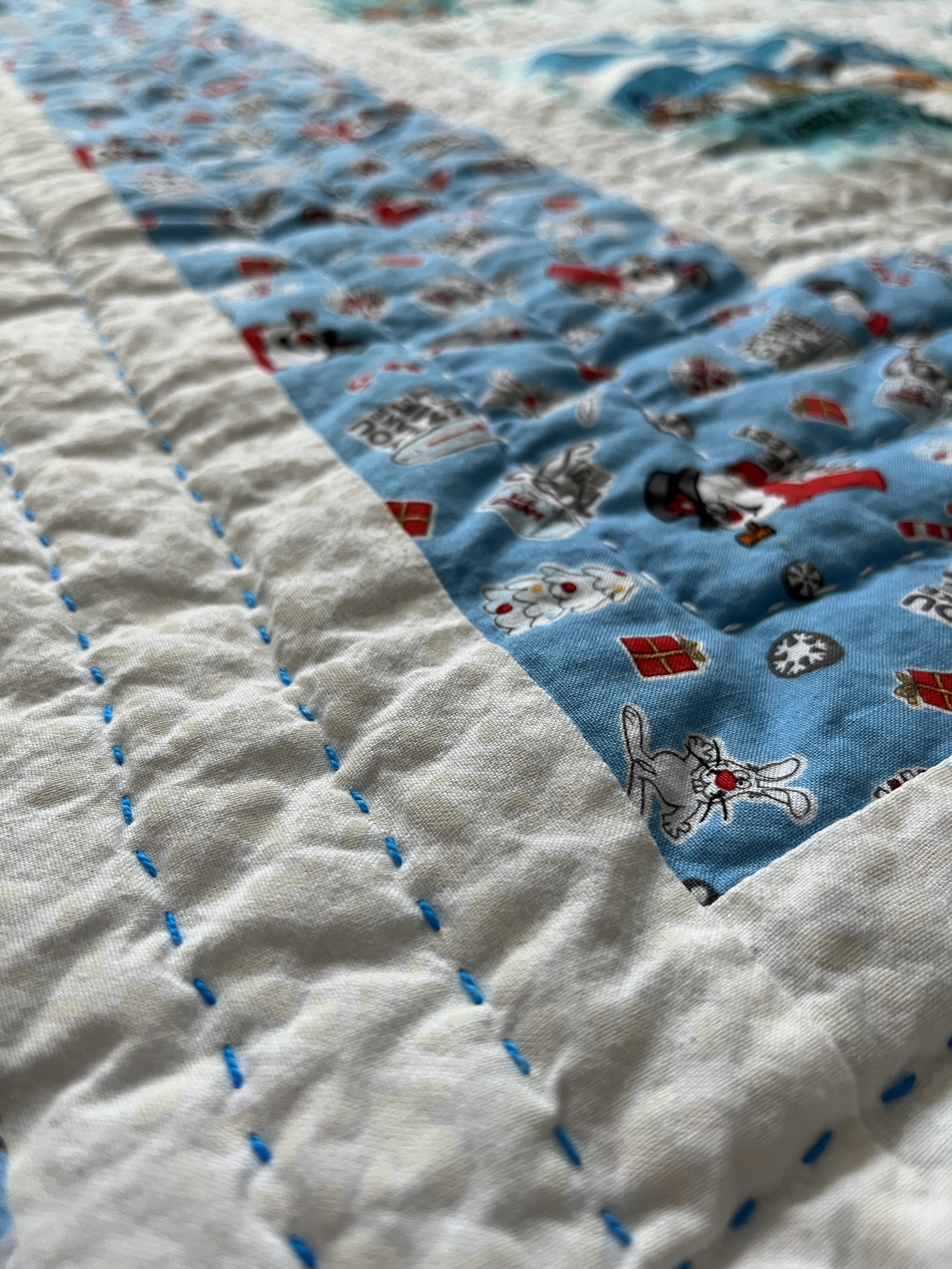 The quilt is bound with a non-Frosty, non-Christmas blue and white patterned fabric. While thematically it doesn’t fit, the colors are just about spot-on. Huzzah for making it work!