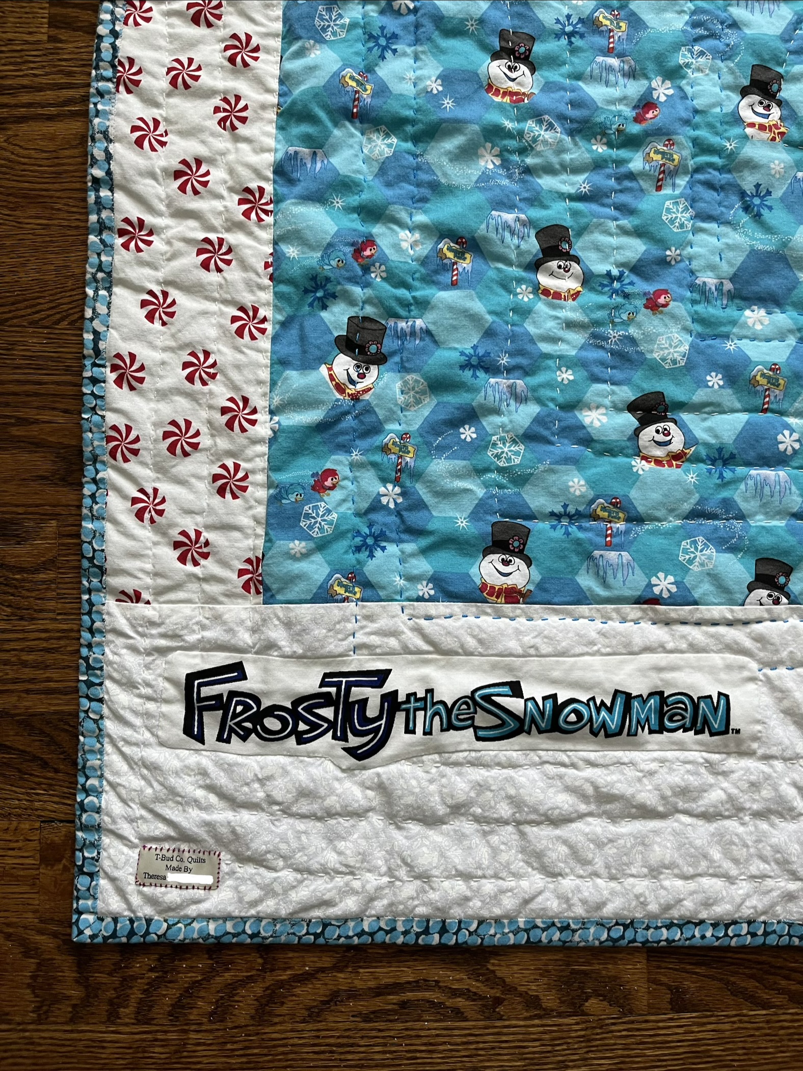 From the original cut-and-sew panel, I snagged the “Frosty the Snowman” logo. Using the needle-turn appliqué technique, I attached the logo to the back of the quilt, right above my label. That Rankin/Bass typography is just sooo good.