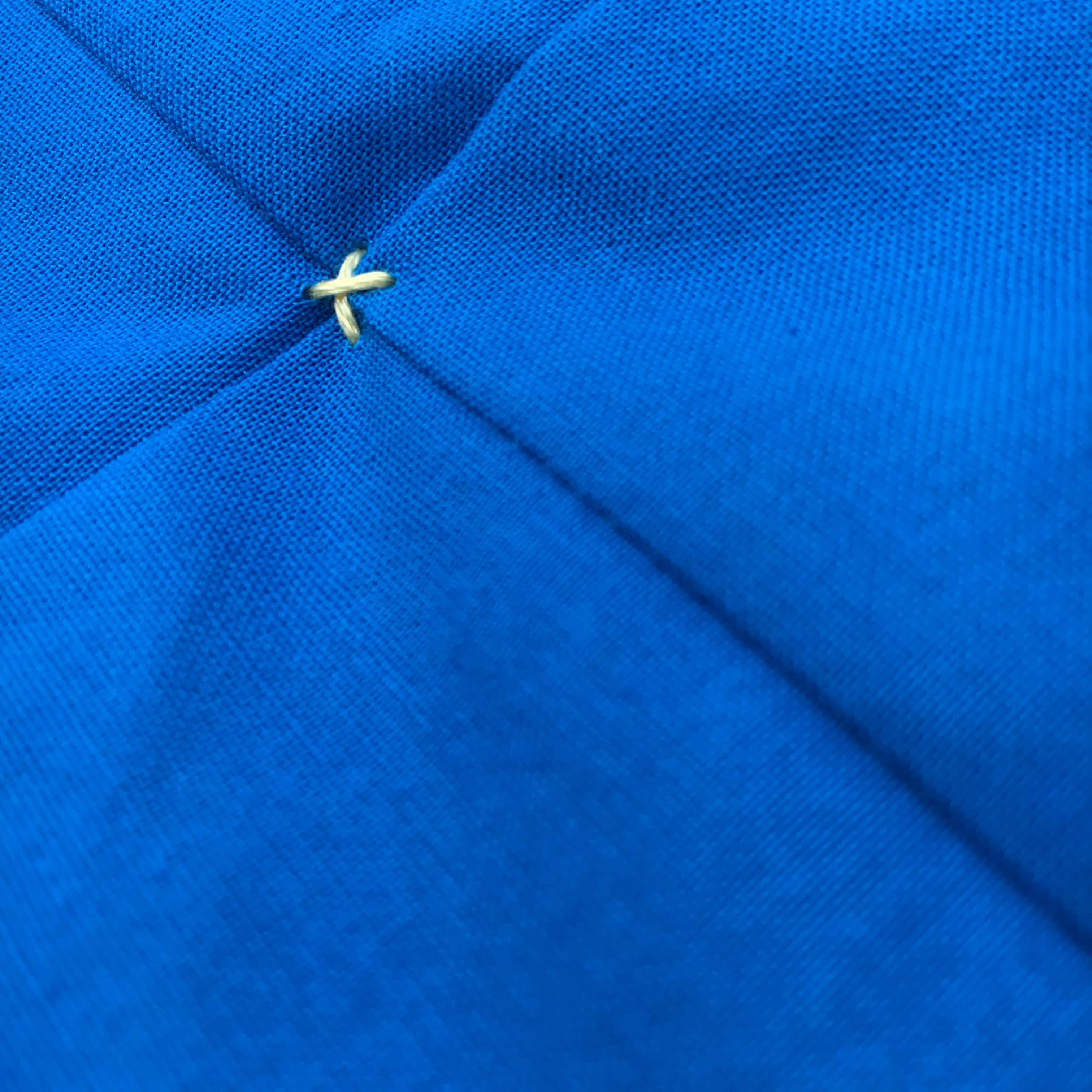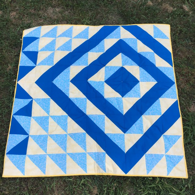 The design is my own, after miscalculating how much fabric I would need and making do with the fabric I had. I wanted to play with half square triangles, and after I had them made, I arranged them until I was happy with the layout. I tied the quilt with an “X” (crisscross) on the front and the knot on the back.