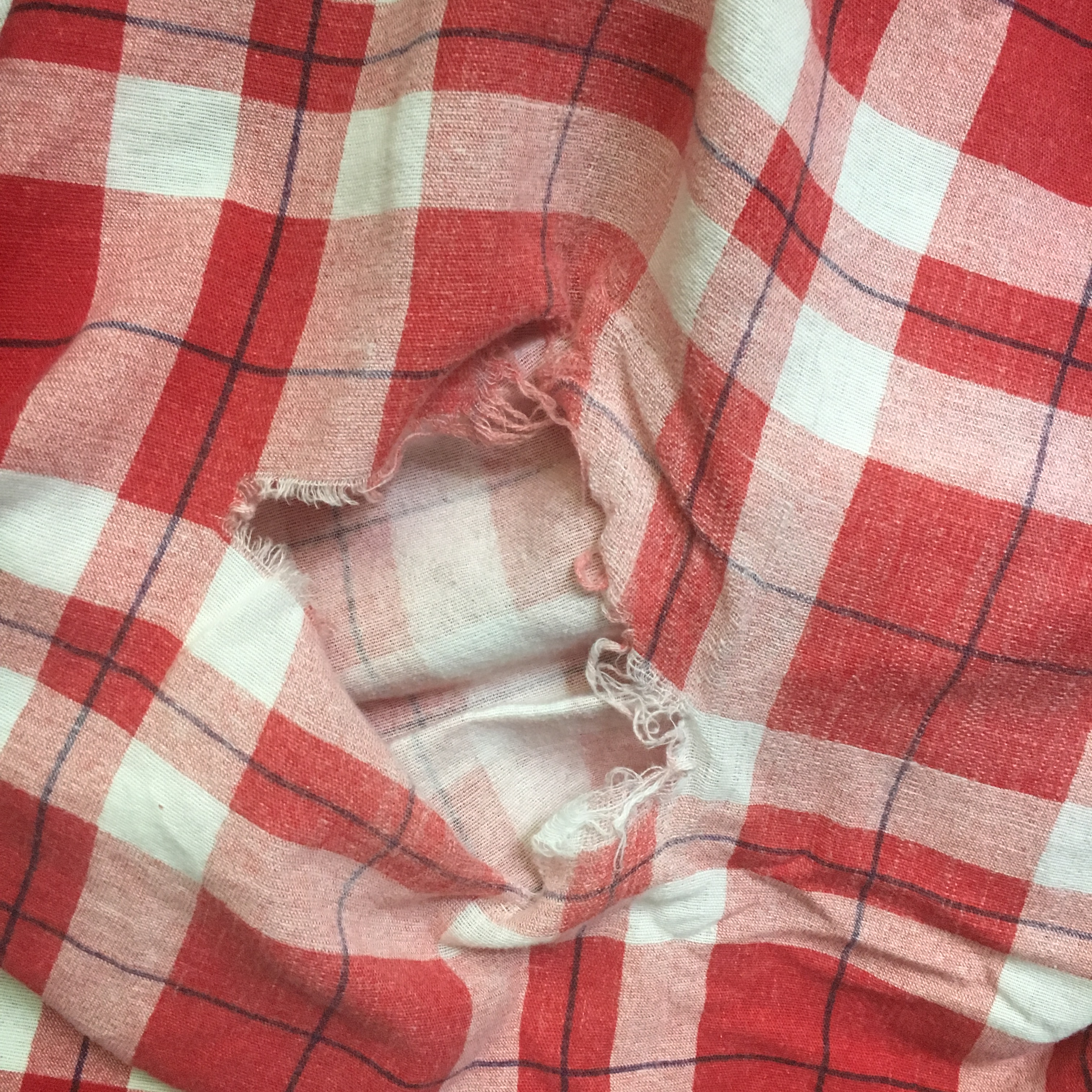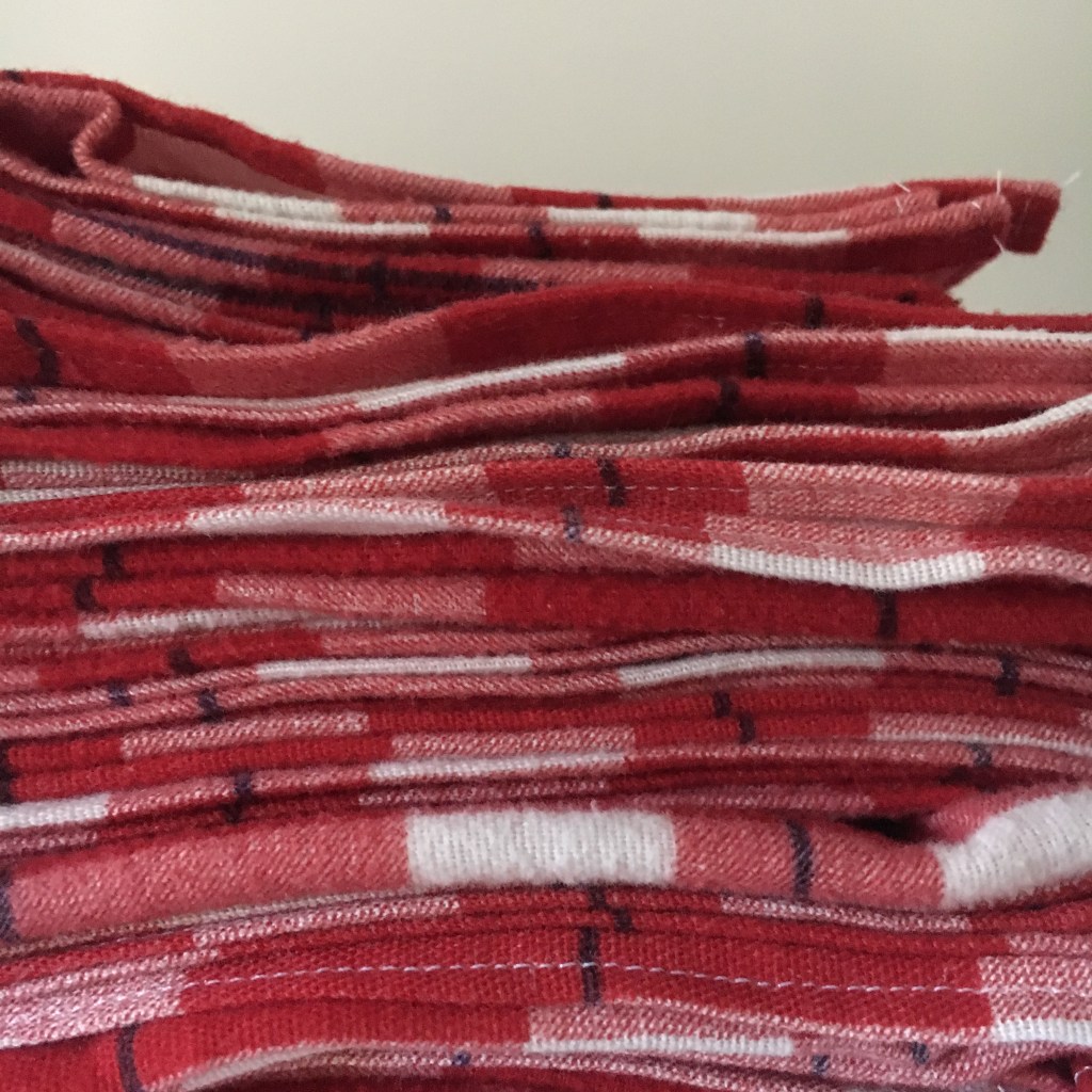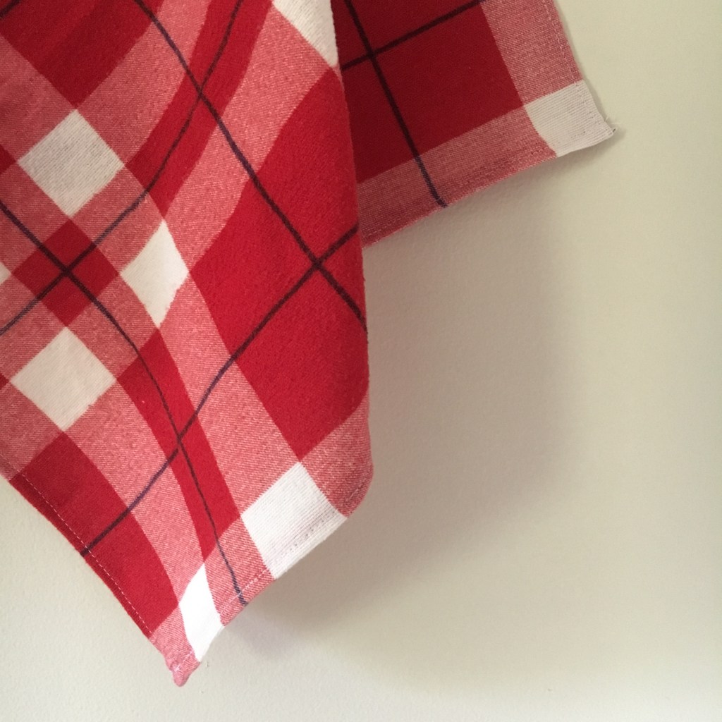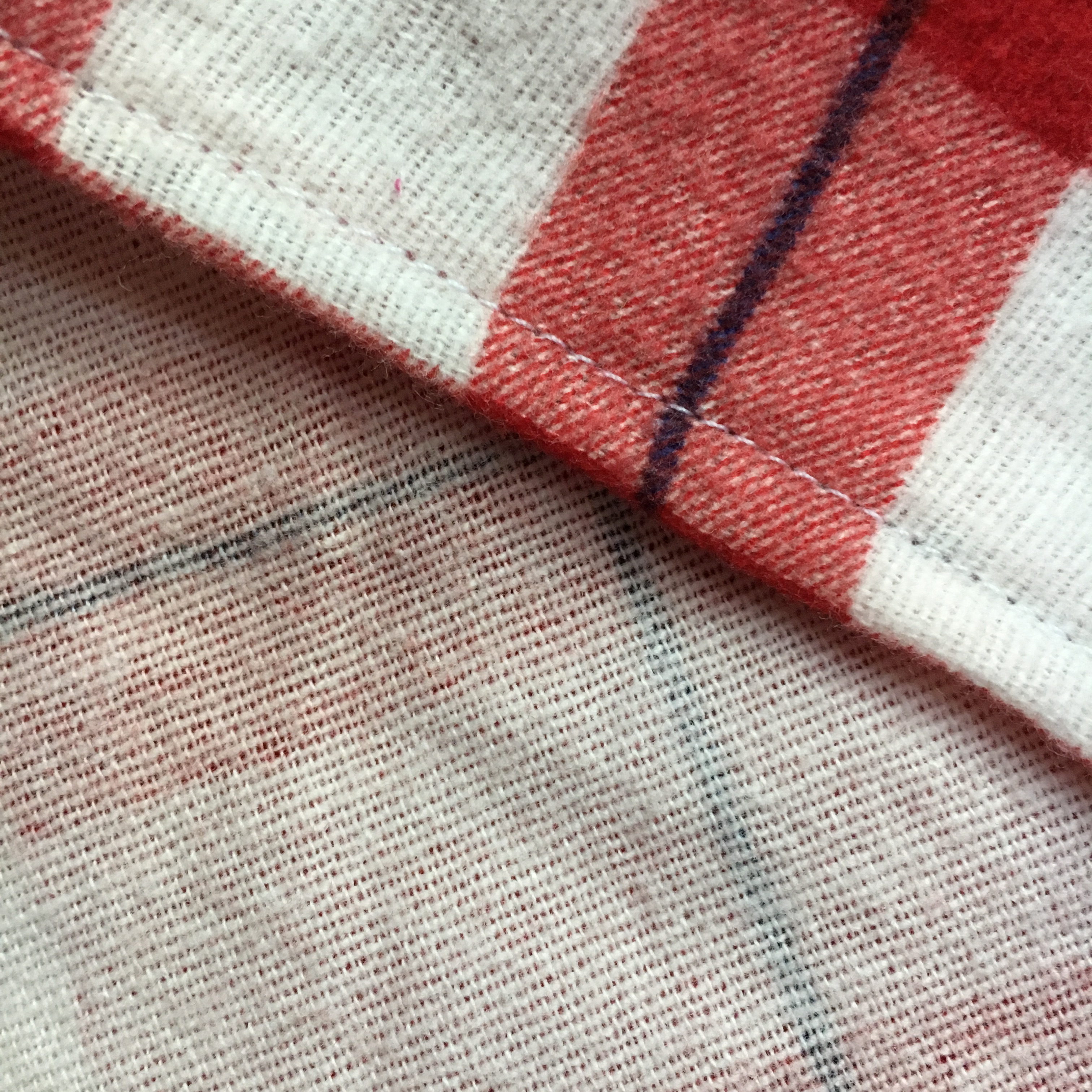 Because this sheet was to become hankies, I wasn’t too worried about how they looked in the end. I mean, they’re going to wipe up snot. I simply cut out as many squares as I could by cutting along the plaid pattern. Further evidence of this sheet being fast home décor? The plaid isn’t yarn-dyed, it’s piece-dyed (piece-printed?). Most plaids are yarn-dyed. Go to your closet and check out your favorite plaid shirt and flip it over to the reverse side. The reverse should look like the front and not plain. The reverse of this sheet is white, not plaid: piece-dyed. Because of this, cutting along the plaid pattern didn’t necessarily result in true square pieces. But, whatever—snot.