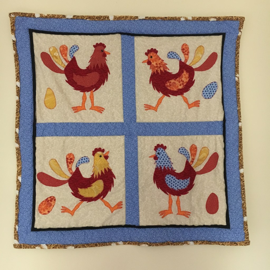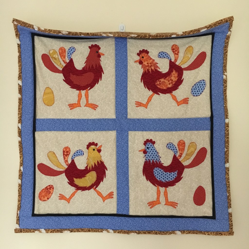 I started this chicken wall hanging back in 2012 and maybe finished in 2013. It’s all a little hazy. The pattern is “Ditzy Chicks” by Sharon Berna of Redbird Designs. I love the pattern because I love chicken décor in my kitchen. I enjoyed starting this wall hanging because I began when my mom was visiting and we picked out the fabric together and she even helped me do the appliqué. Buuuut, this felt way more like a craft project than a quilt, probably because I wanted chicken décor for my kitchen, not because I necessarily wanted to make a quilt. (I have since changed, of course.)