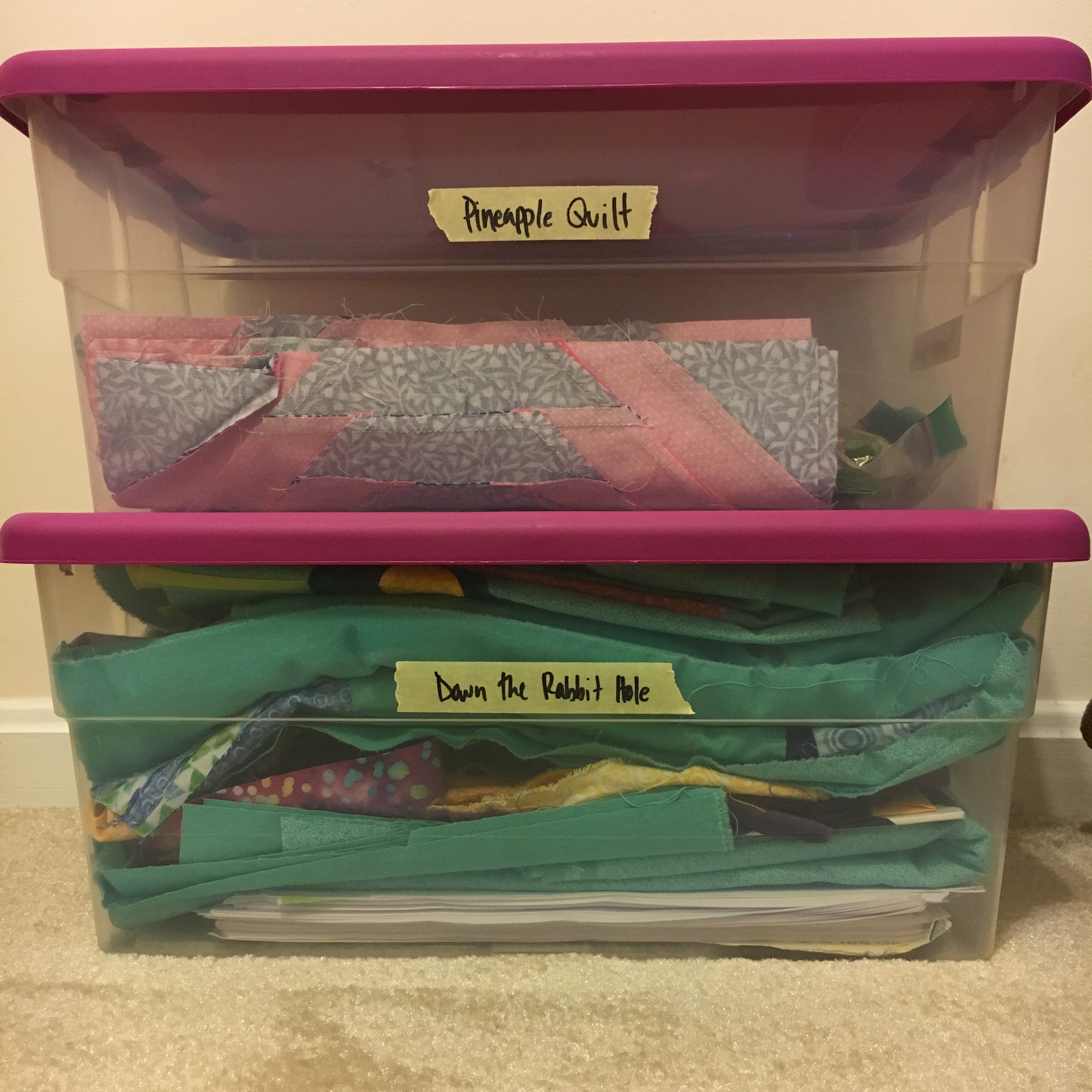 First up was organizing my in-progress quilts. I have 3 quilts that are in different stages of completion. One is clearly in need of being finished first and I have moved it to the front burner. The other two have been pushed to the back burners—or should I say, into storage bins? My Dazzling Pineapple Patch Quilt and my Down the Rabbit Hole Quilt are neatly tucked into these bins, but they won’t be forgotten!