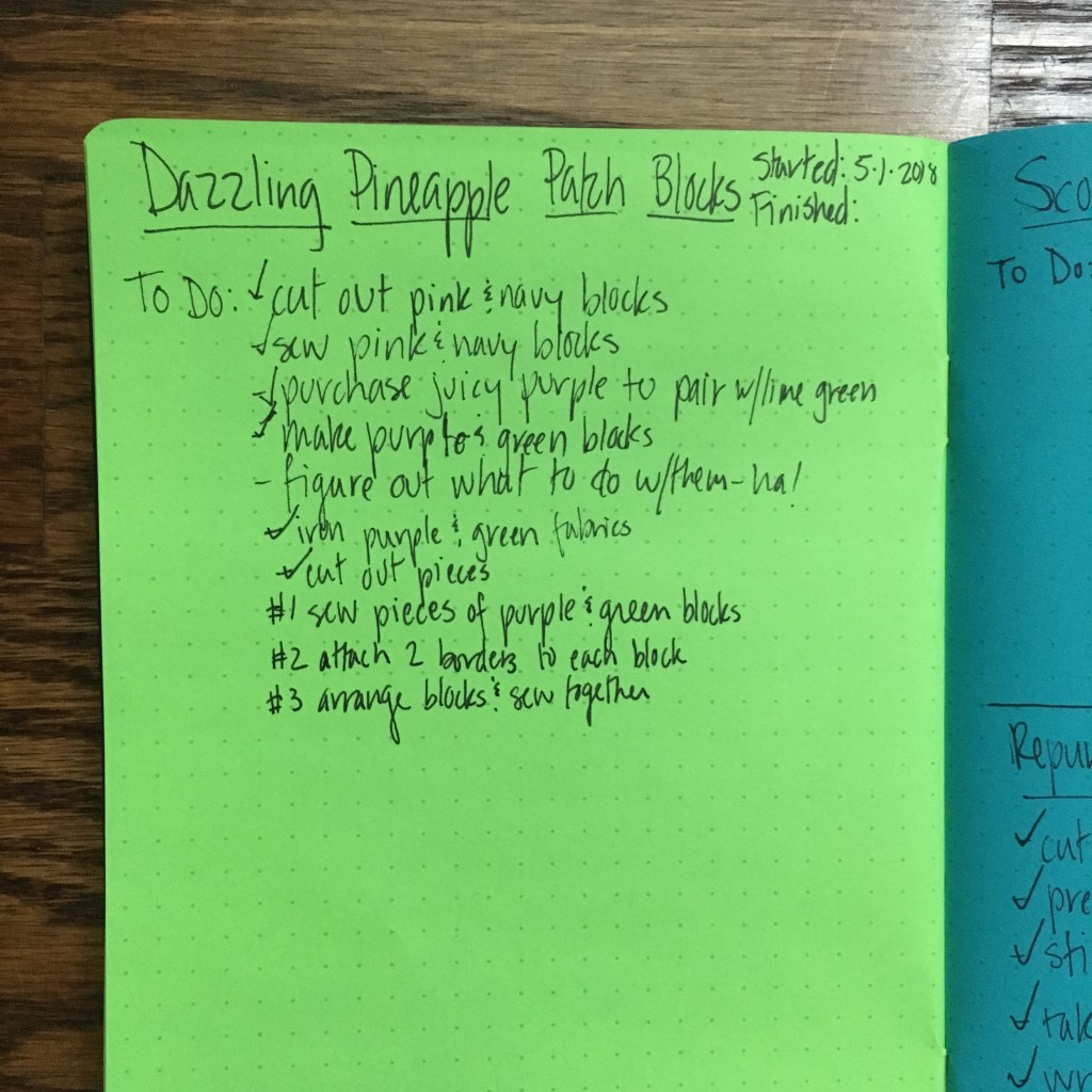 To make it easier to quickly pick back up where I left off with these quilts, I started a quilting/sewing notebook. I’ve written each quilt or project at the top of a page and listed out what needs to be done. Sometimes I write steps out, work on the quilt, and then re-prioritize the steps. Not a big deal. These are just quick notes to jump-start progress when I’m ready.
