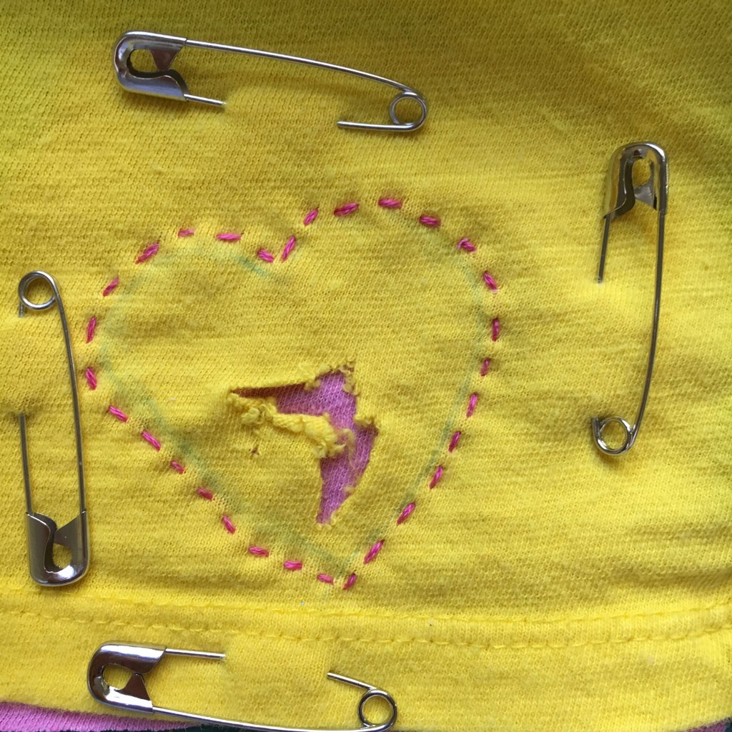 The first step I skipped was researching how to properly repair a hole in a knit fabric. From my memory of what reverse appliqué looks like and works, I decided to use that method—or at least how I figured the technique works! Instead of using a circle or square just large enough to cover the hole, I went with a heart shape.