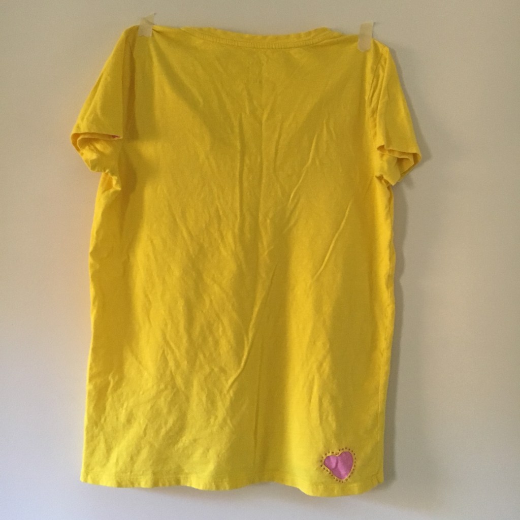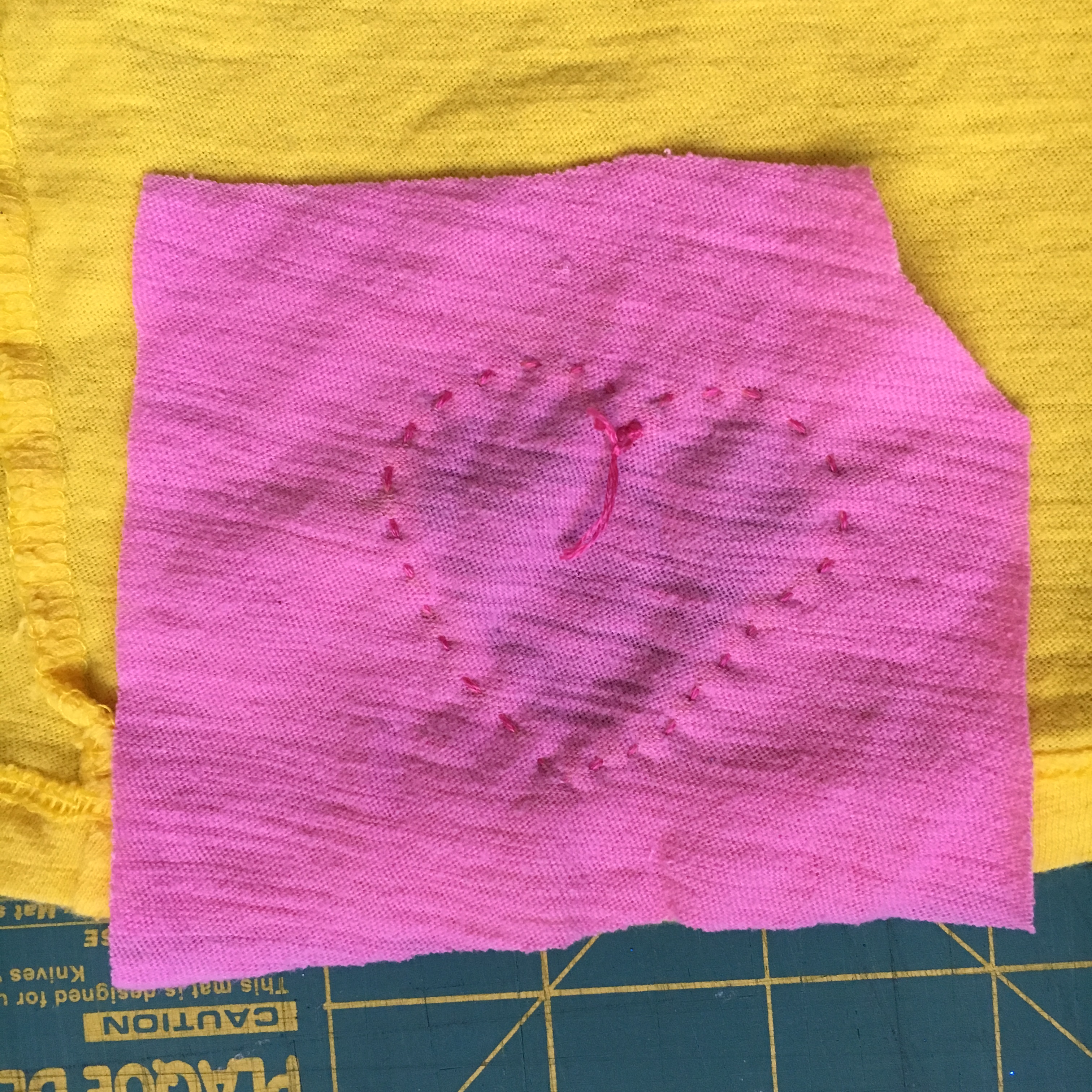 So, my new t-shirt was laying on the floor of the closet and came into contact with the vacuum, ripping a hole. I wasn’t ready to let the shirt go—I had just bought it! I had another fast fashion t-shirt that I had worn for several years, but it was pilling and it didn’t fit well anymore because of, ahem, some weight gain. That shirt became my patch material.