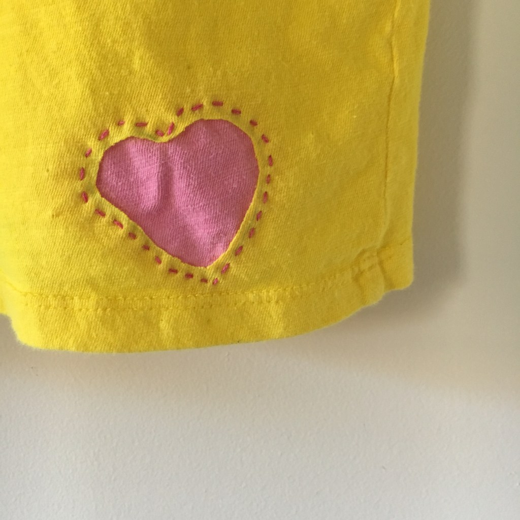 I drew a heart around the hole with a water-soluble pencil and then pinned the patch to the wrong side of the shirt. Using embroidery thread of a complementary color, I stitched around the heart through both the shirt and the patch.
