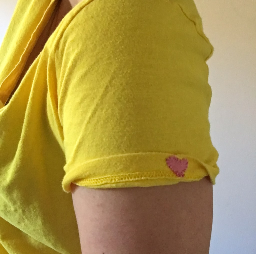 And, just for funsies, I appliquéd a tiny heart on the inside of the left sleeve so that when I flip it up, the heart is visible. Get it? Get it? I’m wearing my heart on my sleeve!