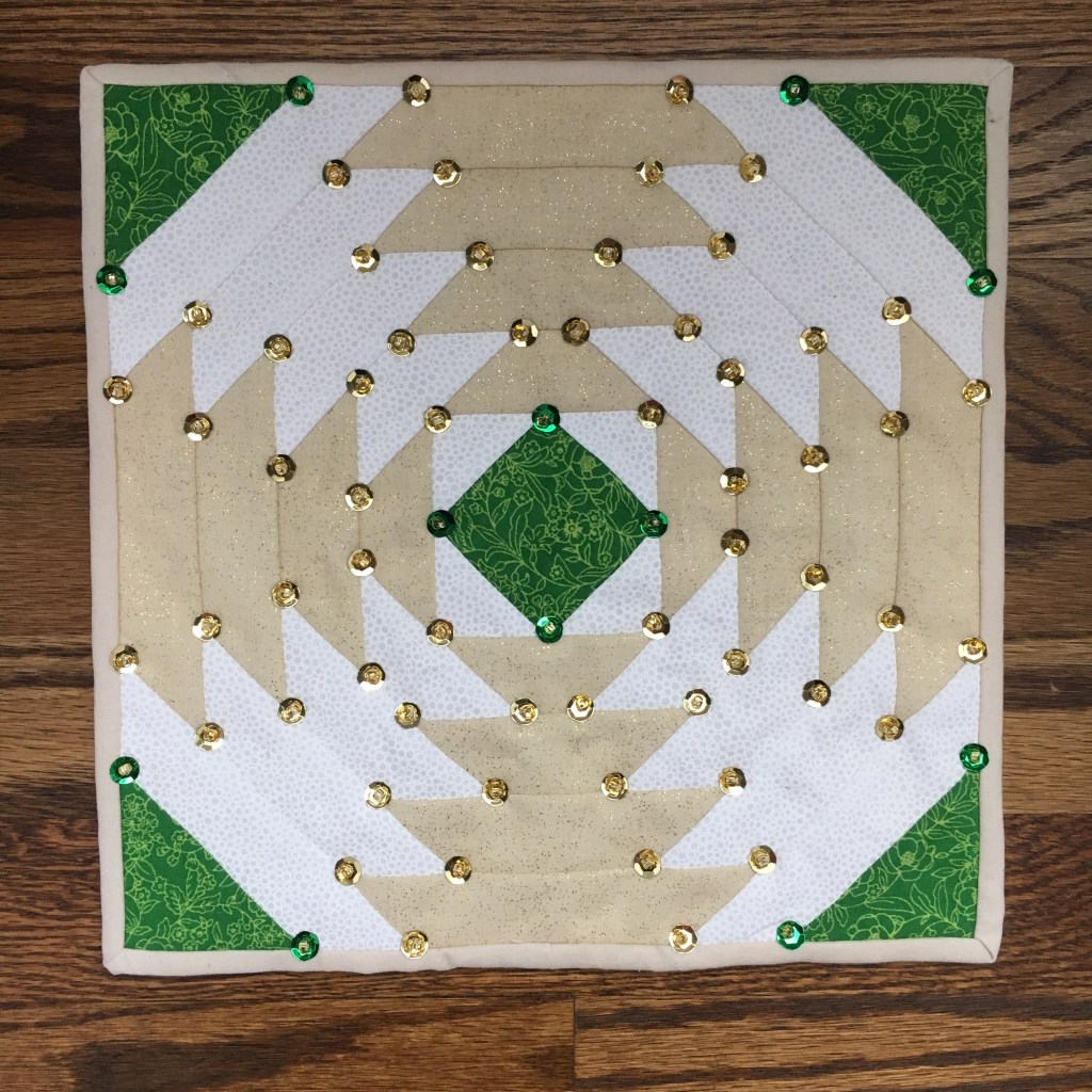 I made this one to see what tying a quilt with sequins and beads would look like. It was an itch that I had to scratch. I like it! I started a larger pineapple quilt, but chose such snazzy colors, I don’t want to finish it with sequins—it would be too much. That quilt top is completed, but it needs to be basted, quilted, and bound. See my post about the mini quilt here.