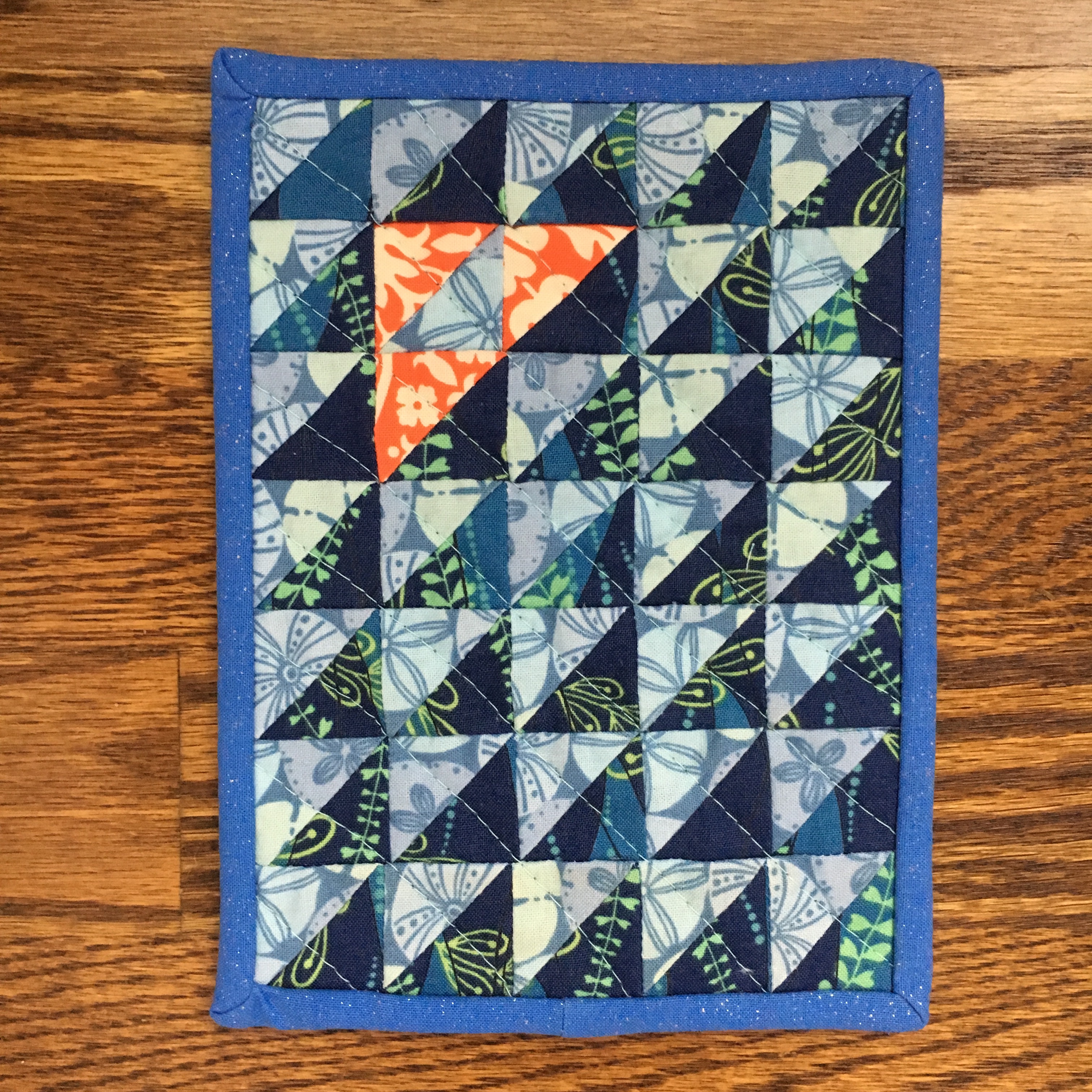 This 5” x 7” quilt went to the 2018 Secret ArtWorks fundraiser that raised funds for ArtWorks, a local organization that promotes arts in this area. The title came after a brainstorming session with my sister and expresses how the trio of orange triangles pop like pieces of sea glass on a beach. (If you look closely, the light blue fabric has a sand dollar print and the dark blue fabric has a seaweed-inspired print.) Again, this quilt I gave away and I have no idea how it was received!