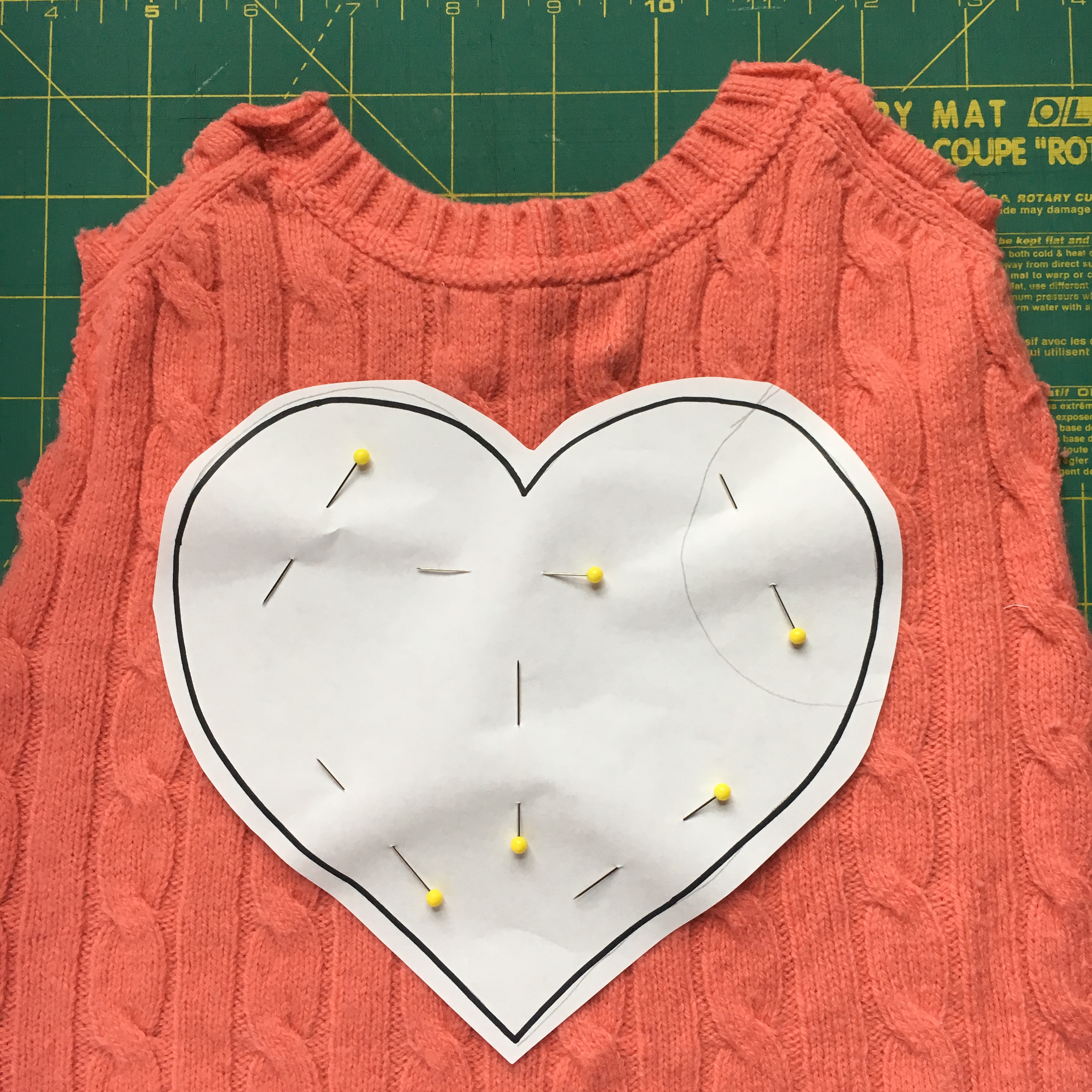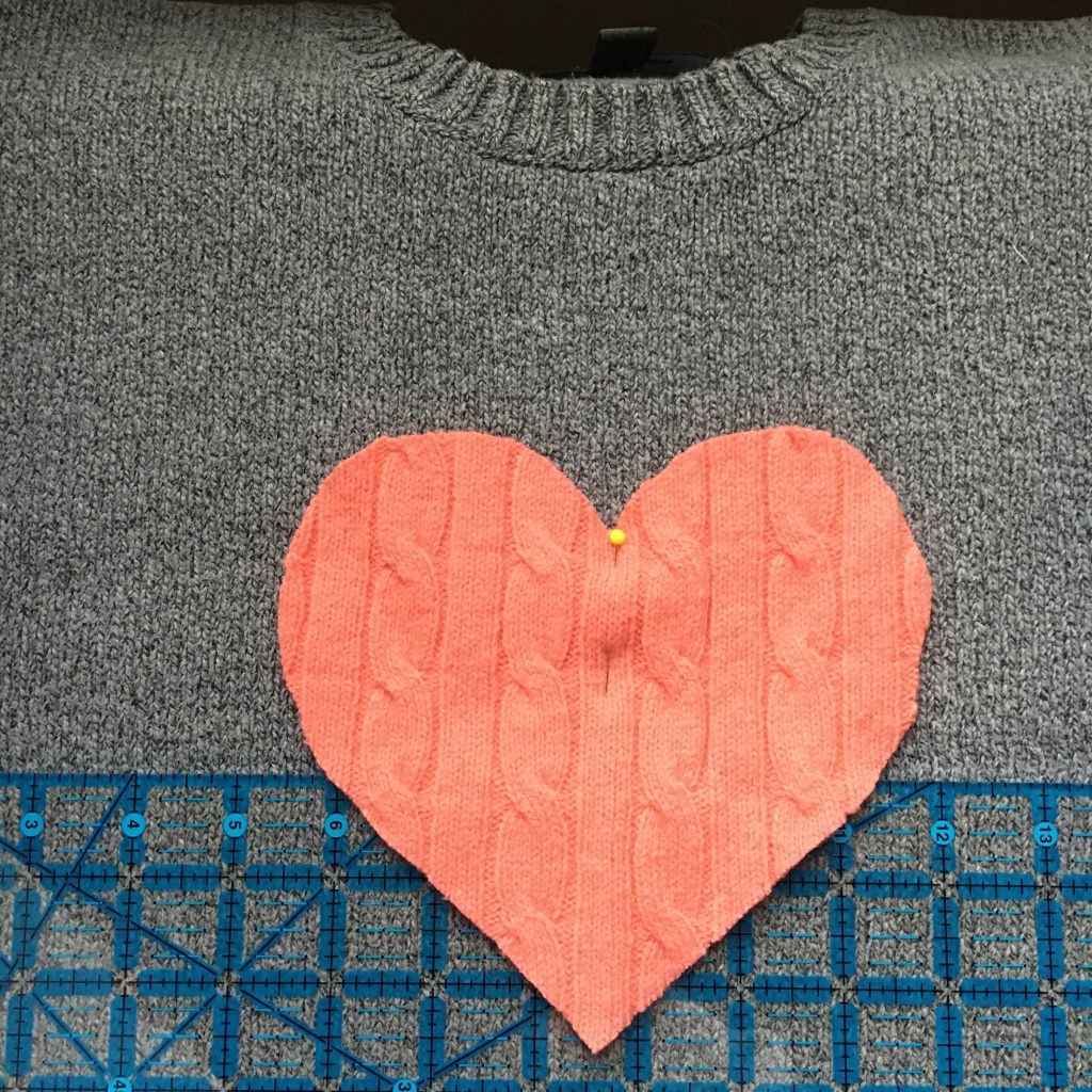 Placement is always tricky—I wanted to have the heart in a good place vertically and centered horizontally. I tried the sweater on, placed the heart where I thought it looked good, and marked the sweater so I could see where I had placed the heart after taking off the sweater. I folded the sweater in half (shoulder to shoulder) so I could find the horizontal center and placed a pin to mark it. Really, I just fussed with the heart until I was happy.