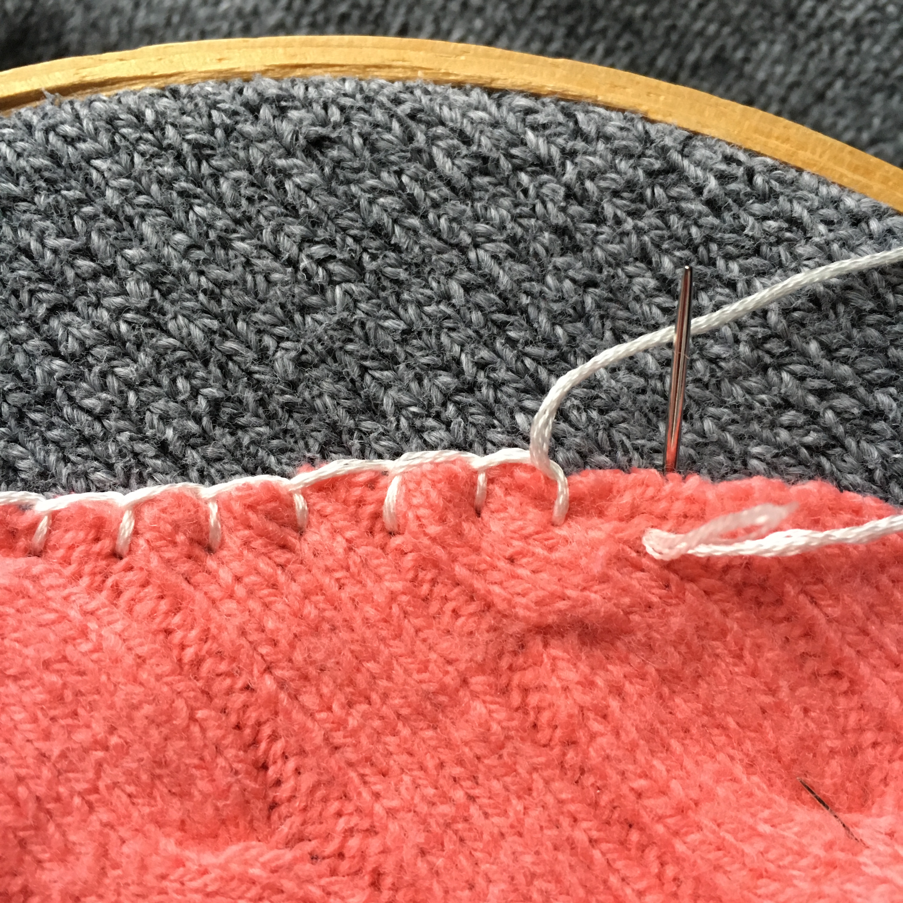 A little bit of washable glue stick and several pins later, I was ready to stitch! I used a blanket stitch with white embroidery floss I had on hand to secure the heart to the sweater. (Side note: it’s not until I actually have needle to fabric that I can remember how to do a blanket stitch. I have such a hard time visualizing it in my head. I think this is why I can’t parallel park. Haha!)