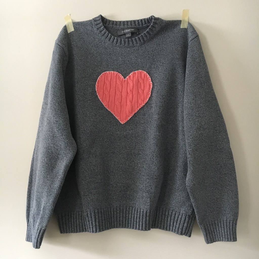 Voilà! I now have a cheery Valentine’s sweater to wear in the weeks leading up to the big day! I love it! One of my favorite things about it is the contrast of the smooth, plain knit of the gray sweater and the textured, cable knit of the appliquéd heart.