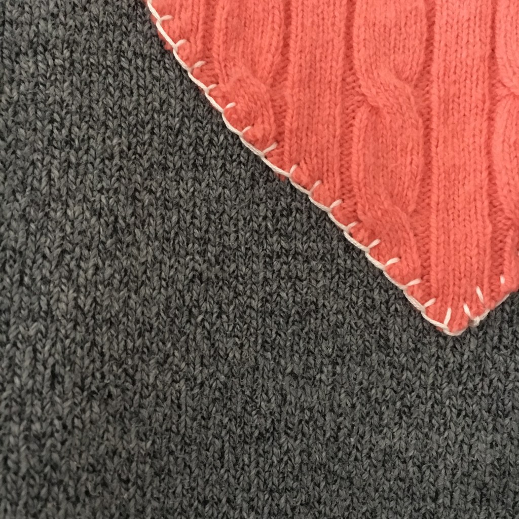 My quest started at the thrift store and my stash of material. First, I found a sweater at the thrift store. I specifically was looking for sweater in a neutral color, made from natural fibers. I scored a dark gray, 100% cotton sweater—perfect! Then, I hit my stash for material for a heart appliqué. For my daughter’s first birthday, I made her stuffed chicken toys from a pinkish-orange, cable-knit thrifted sweater. I knew I had scraps leftover, and dug them out.
