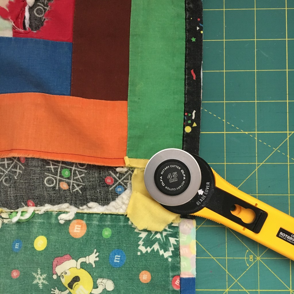 It really didn’t take too much time. My method was simple: I cut off the top row of blocks that had all the wear. I then made binding (continuous bias—my first time!), stitched it to the front of the quilt where the batting was now exposed (going a bit down the sides to create a secure finish), and then hand-stitched the binding to the back. Done!