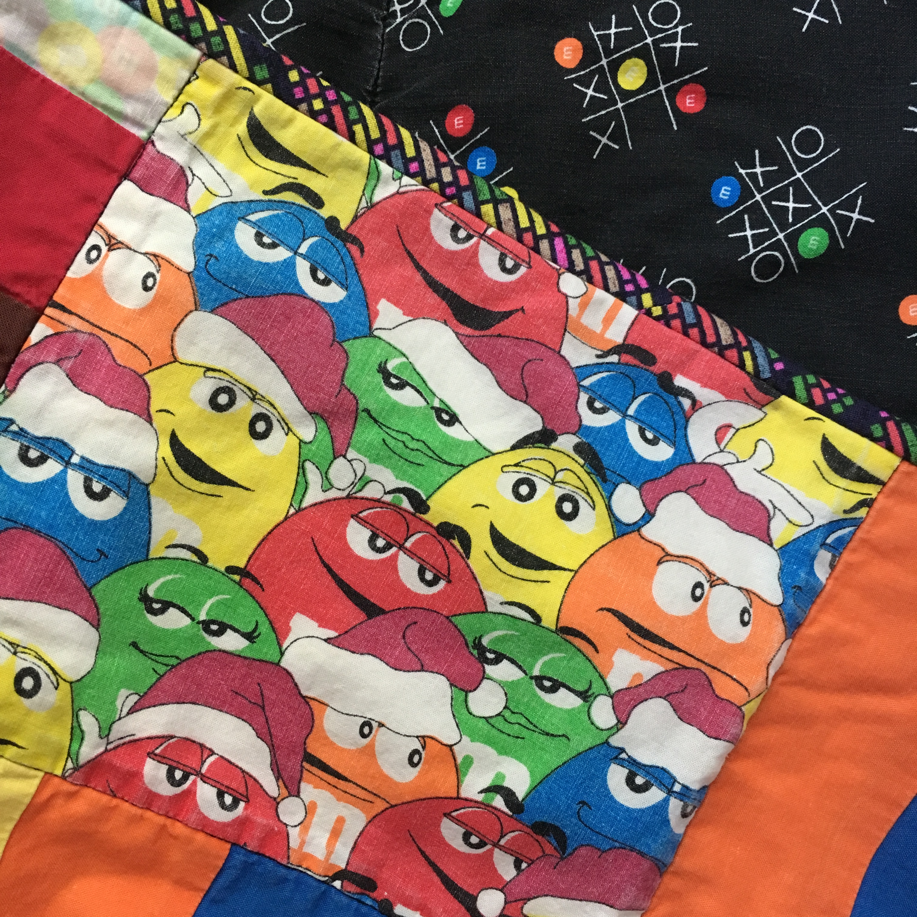 When I left for college, my mom gave me one of the first of her M&M’s quilts. She collected M&M’s fabric for several years and then decided to make a quilt for each of her 6 kids. Luckily, I graduated high school just as she was beginning this endeavor and didn’t have to wait too long for mine. It was my dorm quilt—the quilt I slept under every night for 4 years of college. (I had other quilts and blankets that I layered with it, too.)
