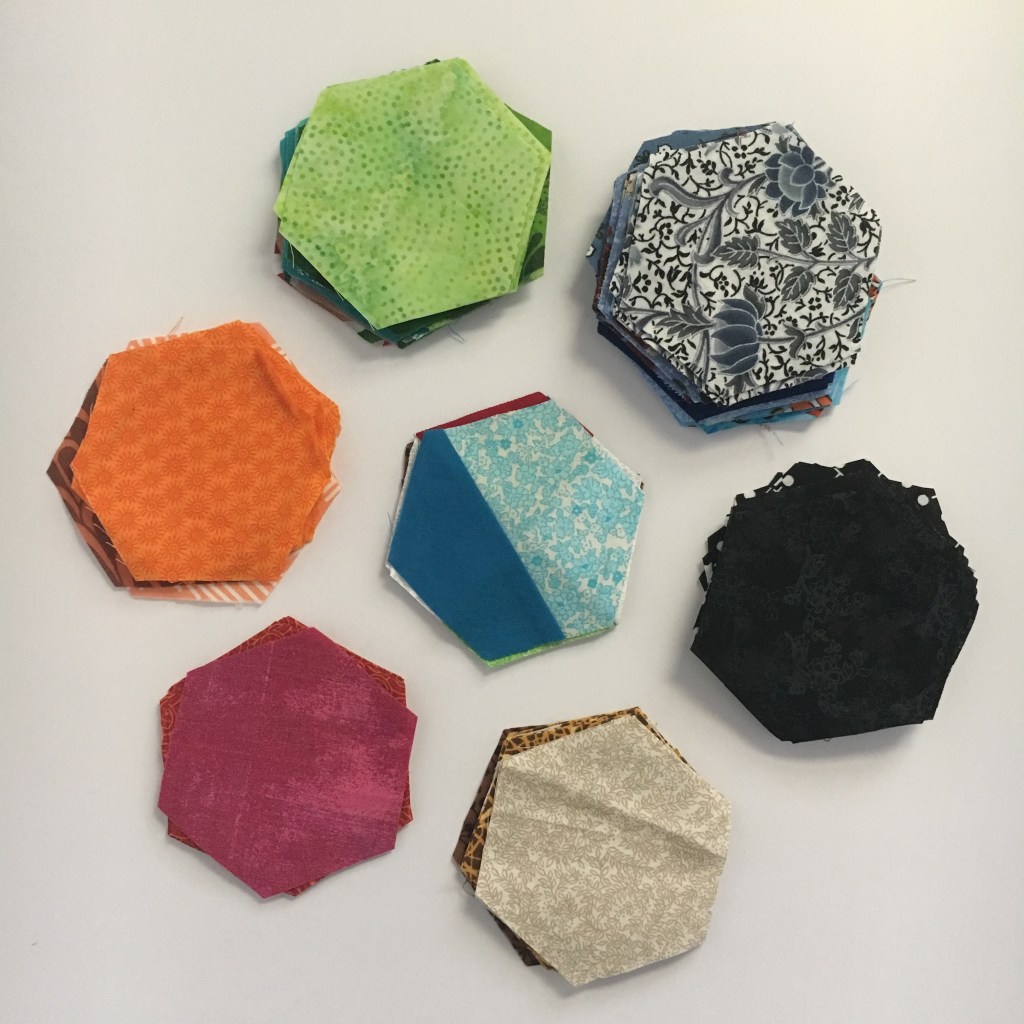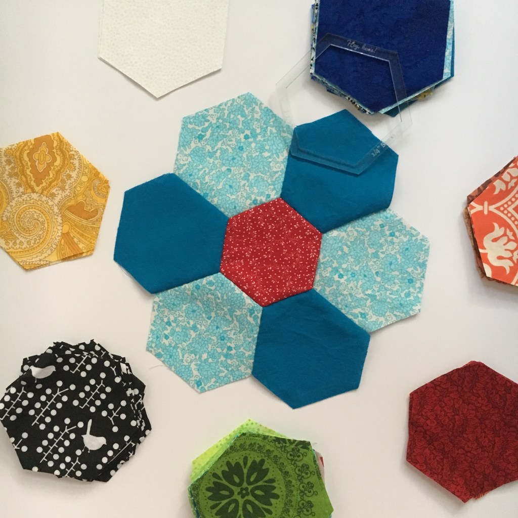 Now, I have a stash of hexies that I can pull from to put together a flower block whenever the urge strikes me. I’ve already made several blocks. I also have about half a dozen sets of hexies chosen to be sewn together so I don’t even have to make any color choices when I’m ready to do some hand sewing!