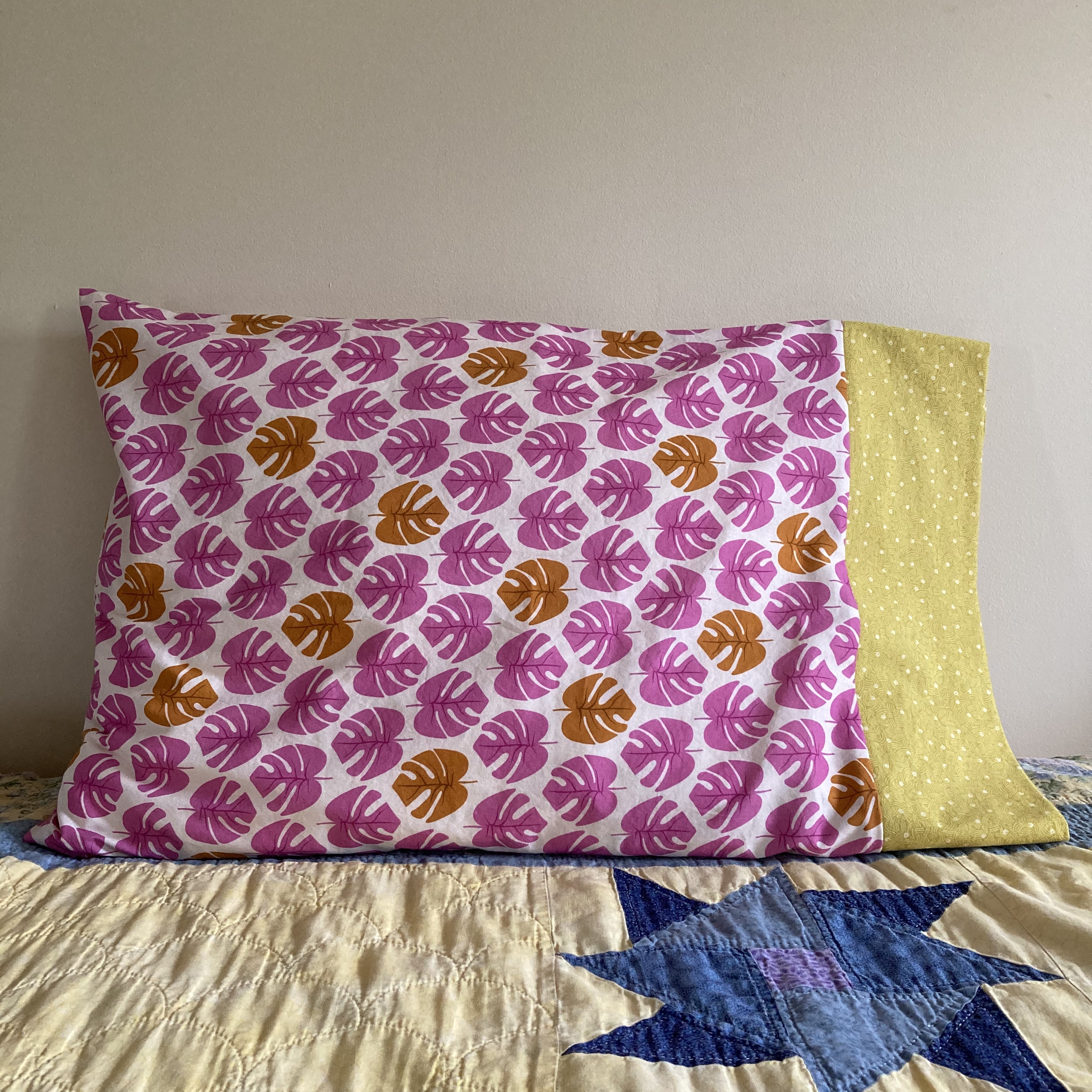 I’m not fussy about my home décor and how I make my standard pillowcases is equally unfussy. Admittedly, I inherited my “lots of fun pillowcases” philosophy from my quilter-sewist mom. (She started my collection.) So, I had a sense of how to make one myself since I’ve watched her make them before. But, the instructions I’m providing are my own—made from simply measuring whatever pillow was on my bed at the time, measuring one of her pillowcases, and doing my best with limited space for cutting large swaths of fabric!