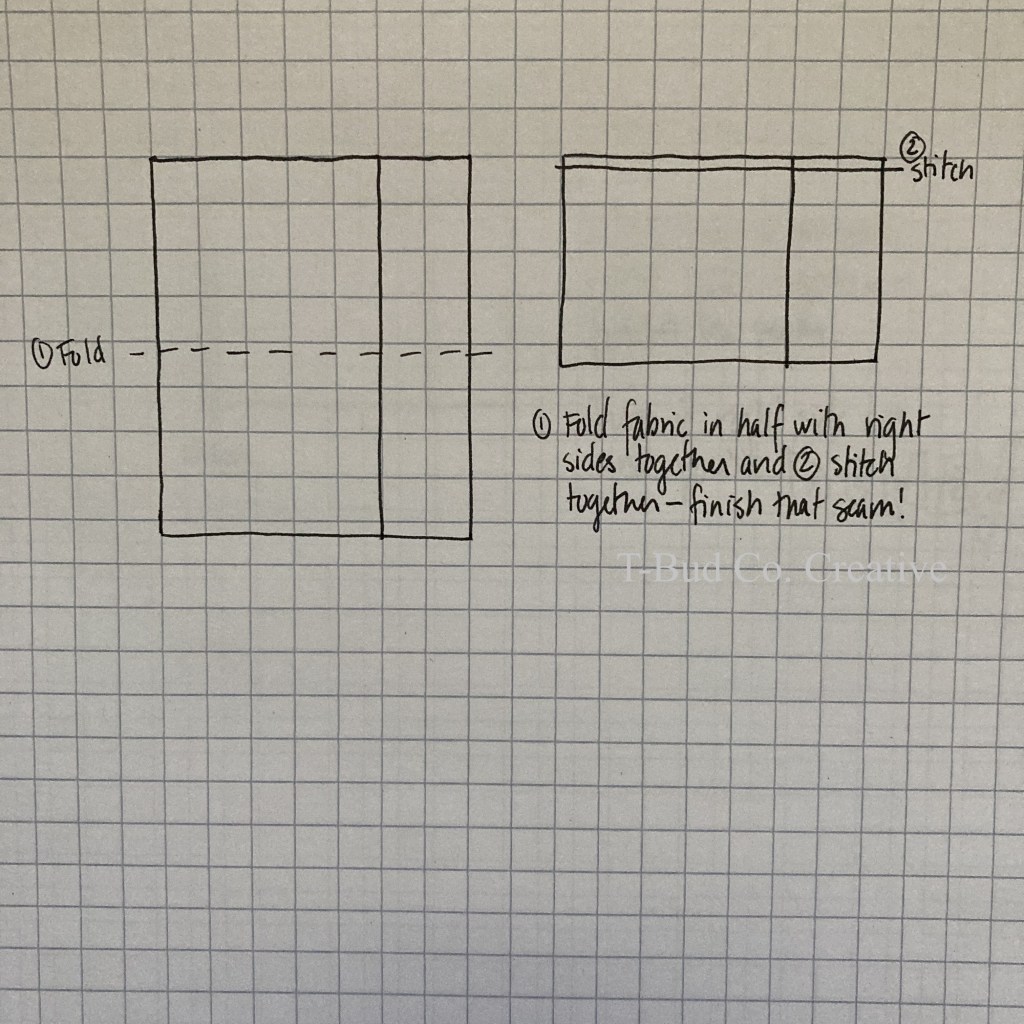 Next, fold the fabric in half with the right sides together and then stitch the long sides together and finish that seam (zigzag stitch, French seam).
