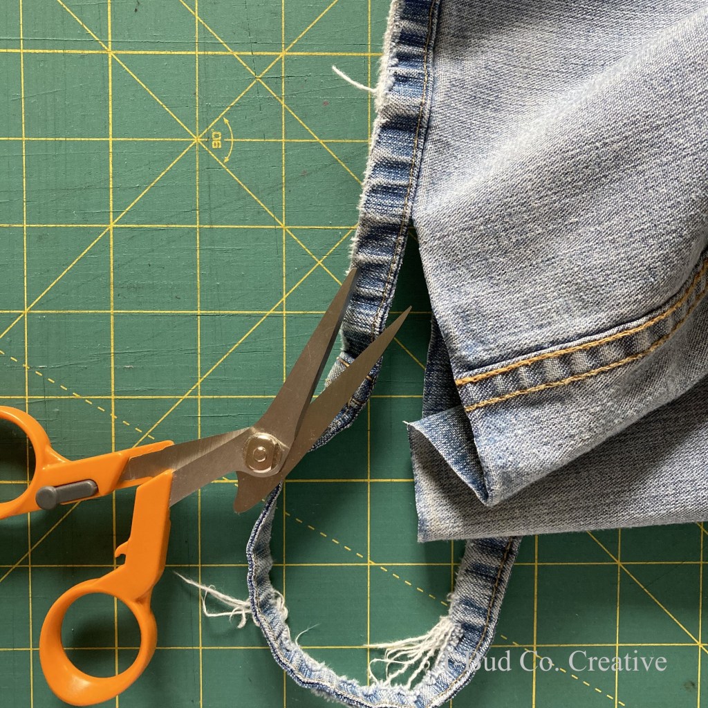 Pinterest, a go-to for inspiration, didn’t have too much about visibly hemming pants. There are about a bazillion tutorials on how to hem jeans with the original hem, but for this project, I didn’t have the patience. I did find this inspiration: jeans with colorful stitching to hold a cuff in place. I wasn’t interested in a cuff as much as just shortening the legs of my jeans.