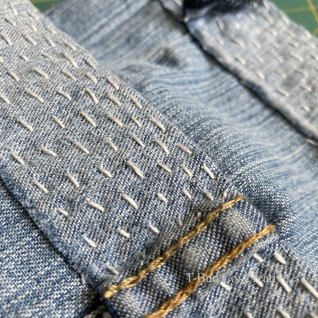I used sashiko-like stitching to hem a pair of thrifted jeans. The inseam now fits better and the jeans have a “visible mending” aesthetic.