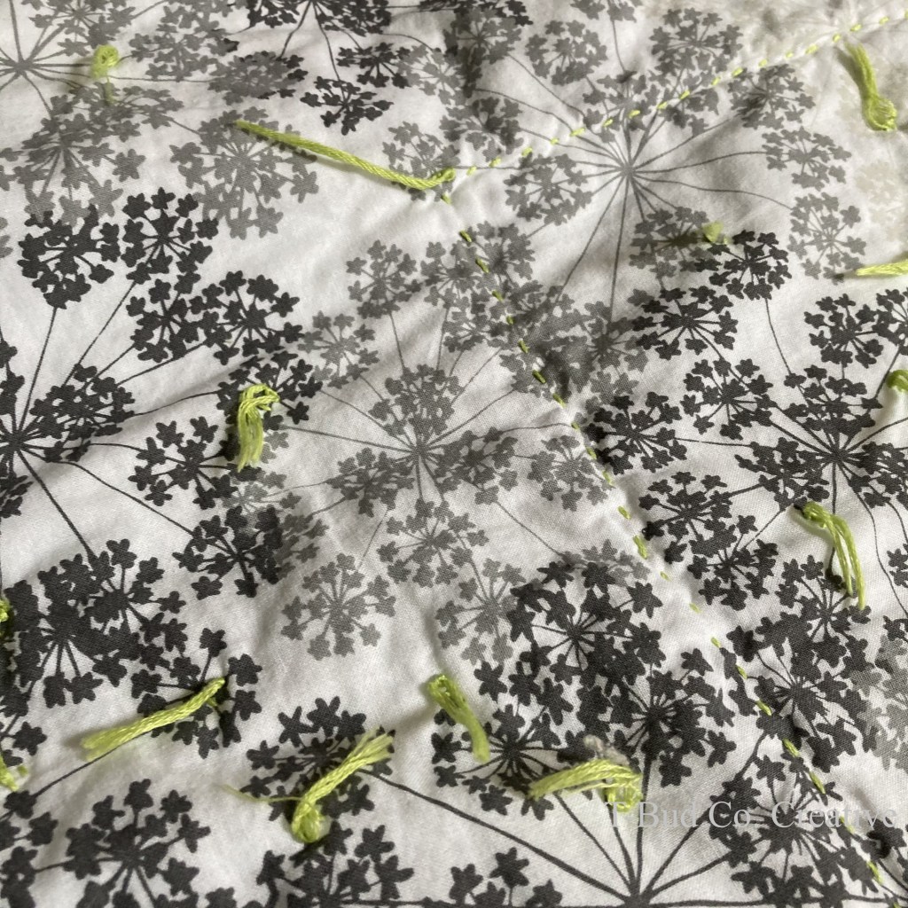 To finish the quilt, I went back and forth about what to do. At 96” square, there’s no way I could ever had machine quilted it myself. To have it professionally quilted with a longarm machine (huge quilting machine that allows quilters to quilt FAST) would have cost a lot. It would have been worth it, but unfortunately it was not in my budget. Hand quilting it would have taken a lot of time. And so, I turned to my good old friend tying. I did crisscross ties with tails in the back in most places, but tied with the tails in the front in each flower to create “stamens” of sorts. I also couldn’t resist doing a touch of big stitch quilting in the thin blue borders and around the half Dresden plates. I’m 100% happy with how it turned out.