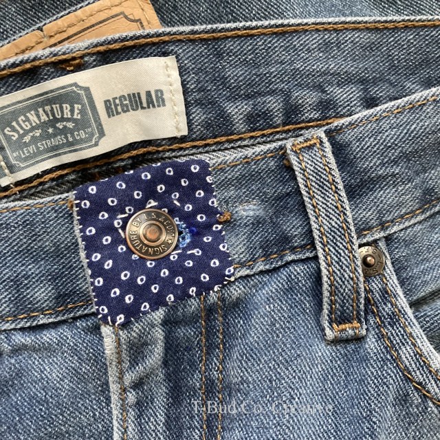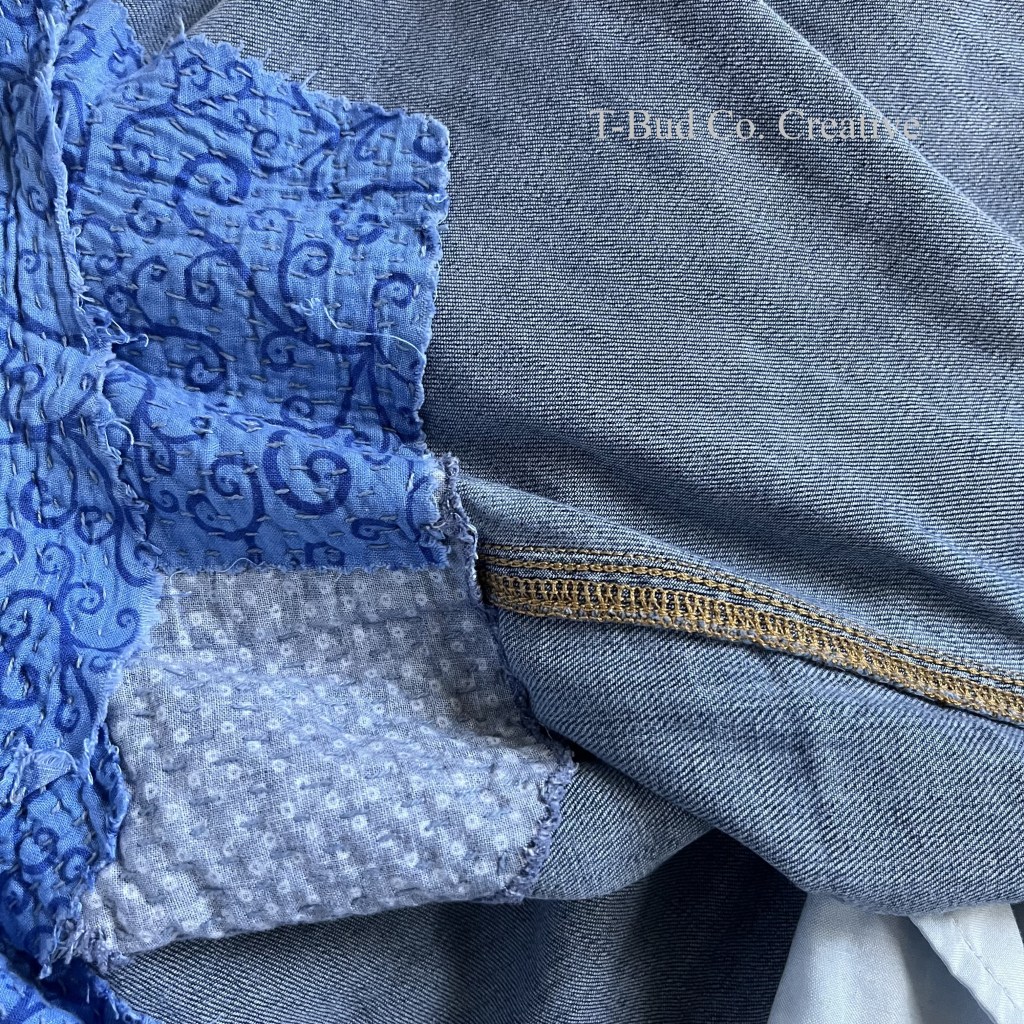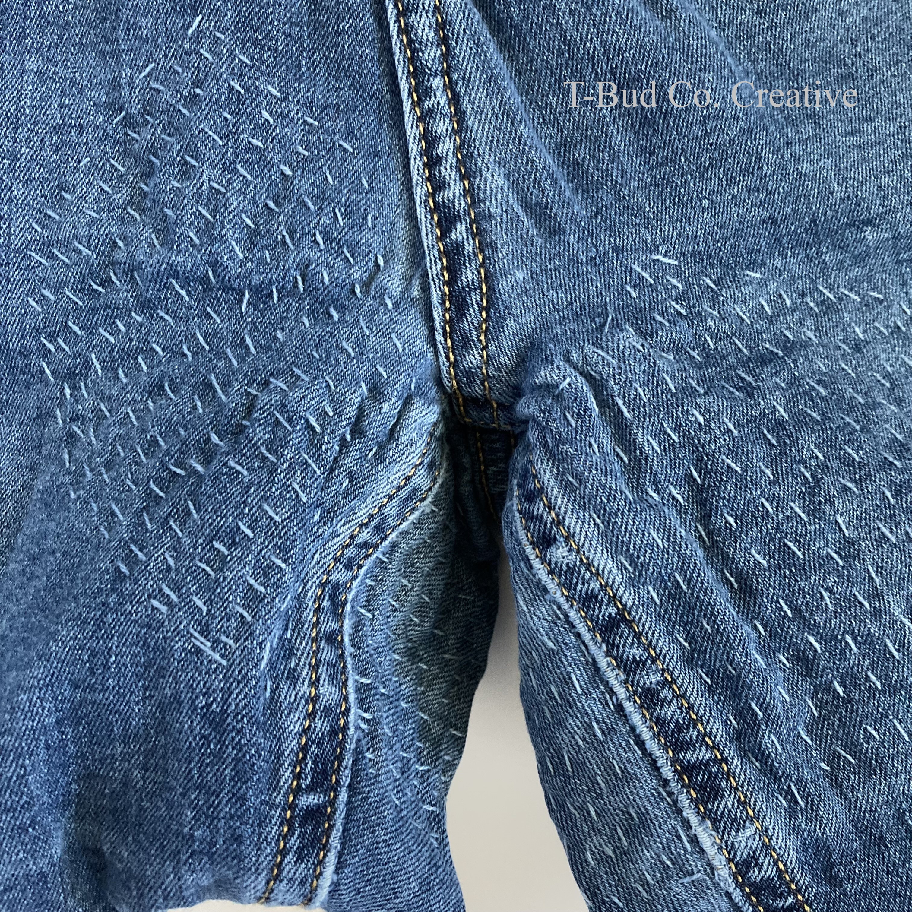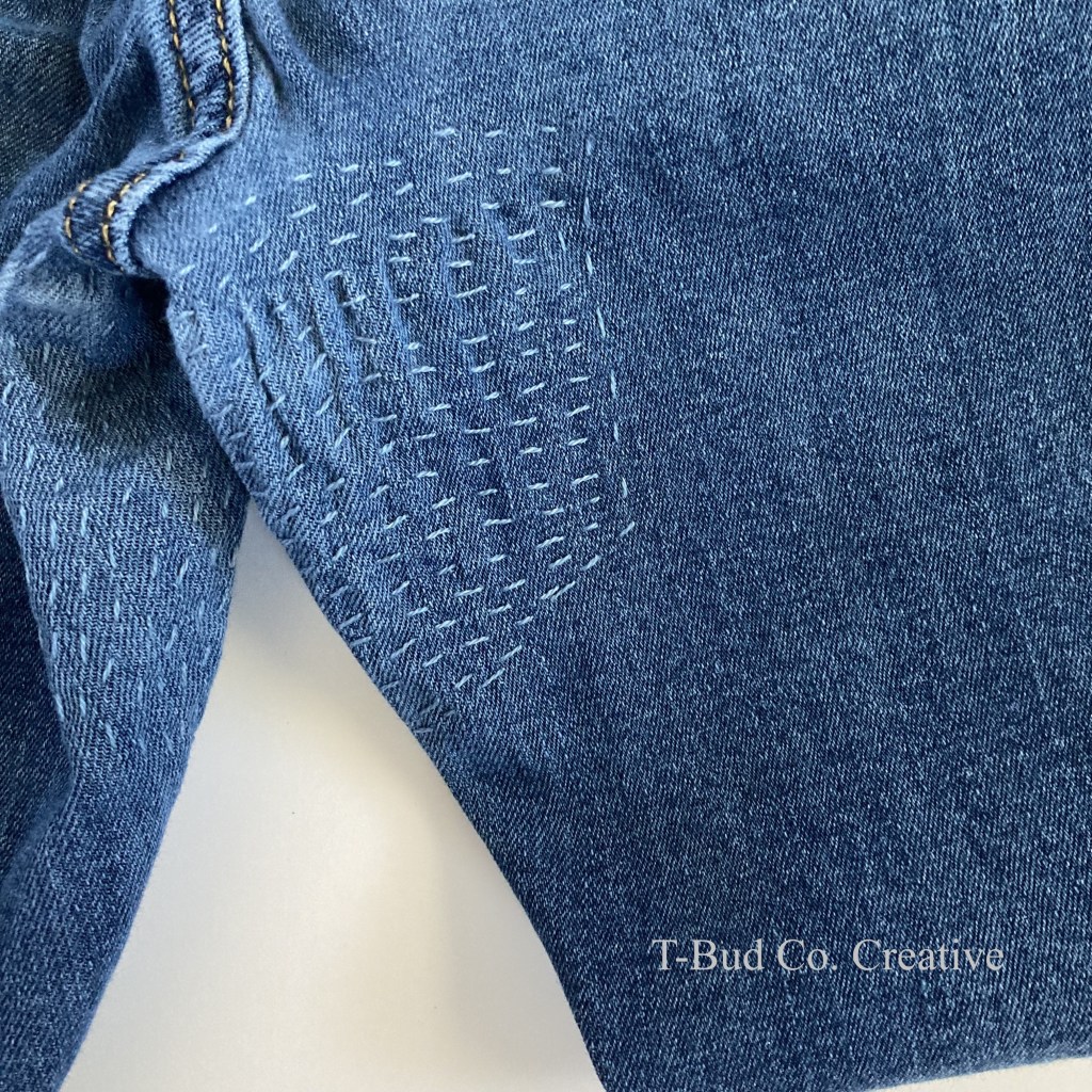 The next pair of jeans, I will wear them a day or two before mending. Then, I’ll be stitching on fabric at its maximum stretched size, not at a shrunken size.
