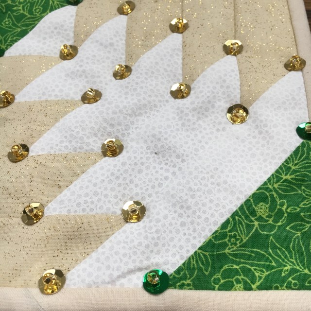 My first finish for 2018 is a mini pineapple block quilt. But, it’s not just any pineapple quilt, because instead of quilting it or tying it in a traditional manner, I tied it with gold sequins and Czech glass beads, using metallic thread of course. I consider this a “study” as I want to make more in snazzier colors!